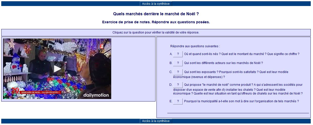 | Support pédagogique | Vidéo : Extrait du journal de France 2, Décembre 2014 Questionnement crée via hot potatoes Texte à trous final (hot potatoes) |