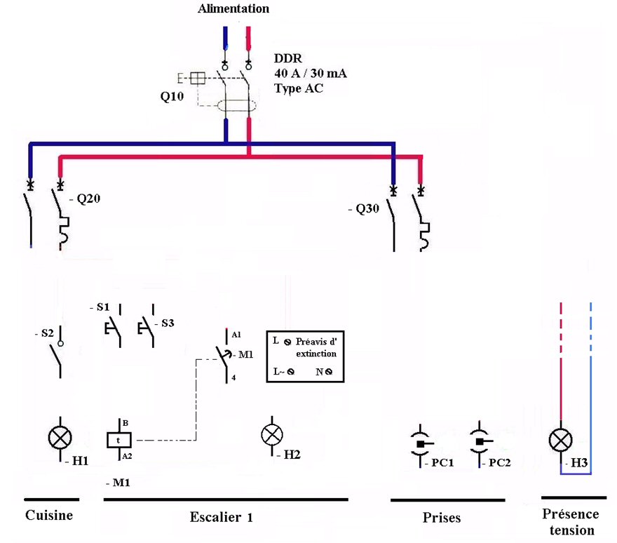 L'escalier permettant de passer du sous-sol au RDC est éclairé par une douille plexo repérée H2 posée en applique et commandée avec un montage minuterie avec préavis d'extinction par appui sur 2 boutons poussoirs S1 (encastré) et S3 (apparent).