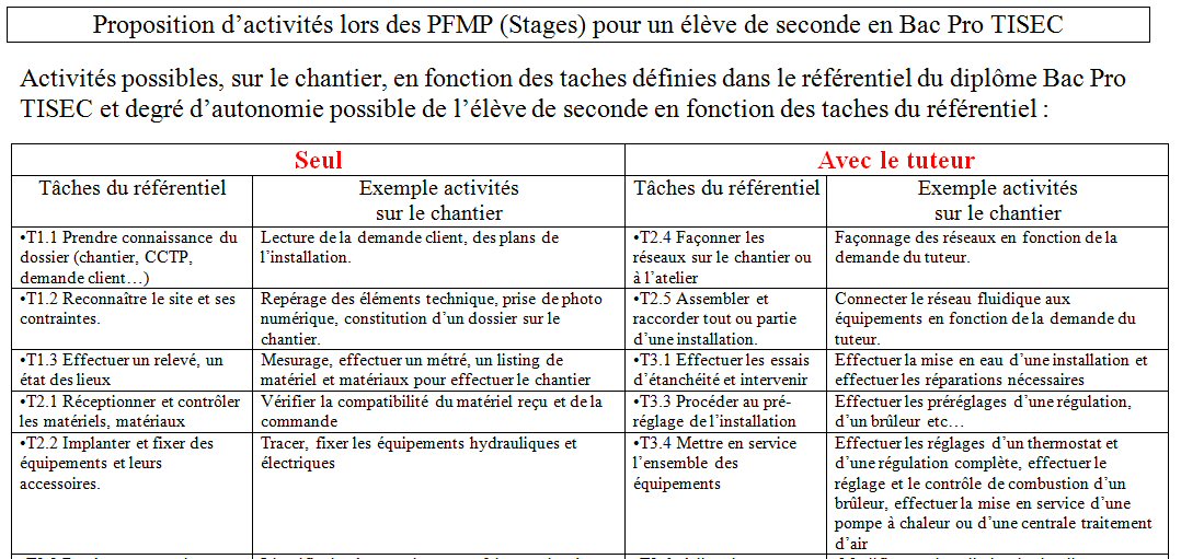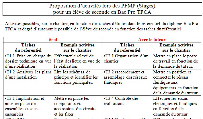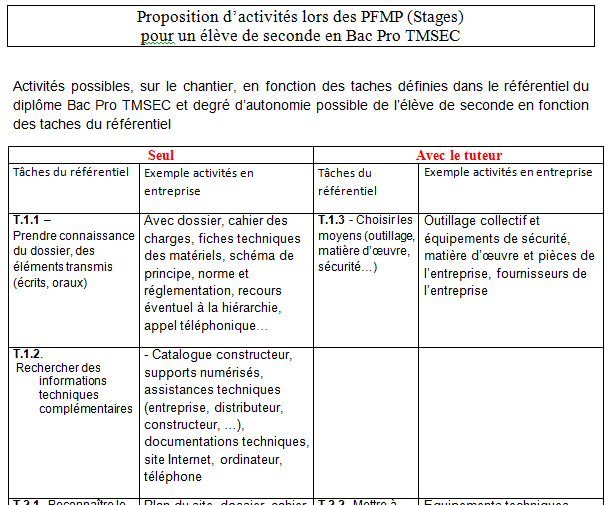 Lors de la première visite d'un élève sur son lieu de PFMP, ou lors d'une visite préalable a la PFMP, il est intéressant de "négocier" les taches professionnelles que l'élève devra développer lors de sa période en entreprise.