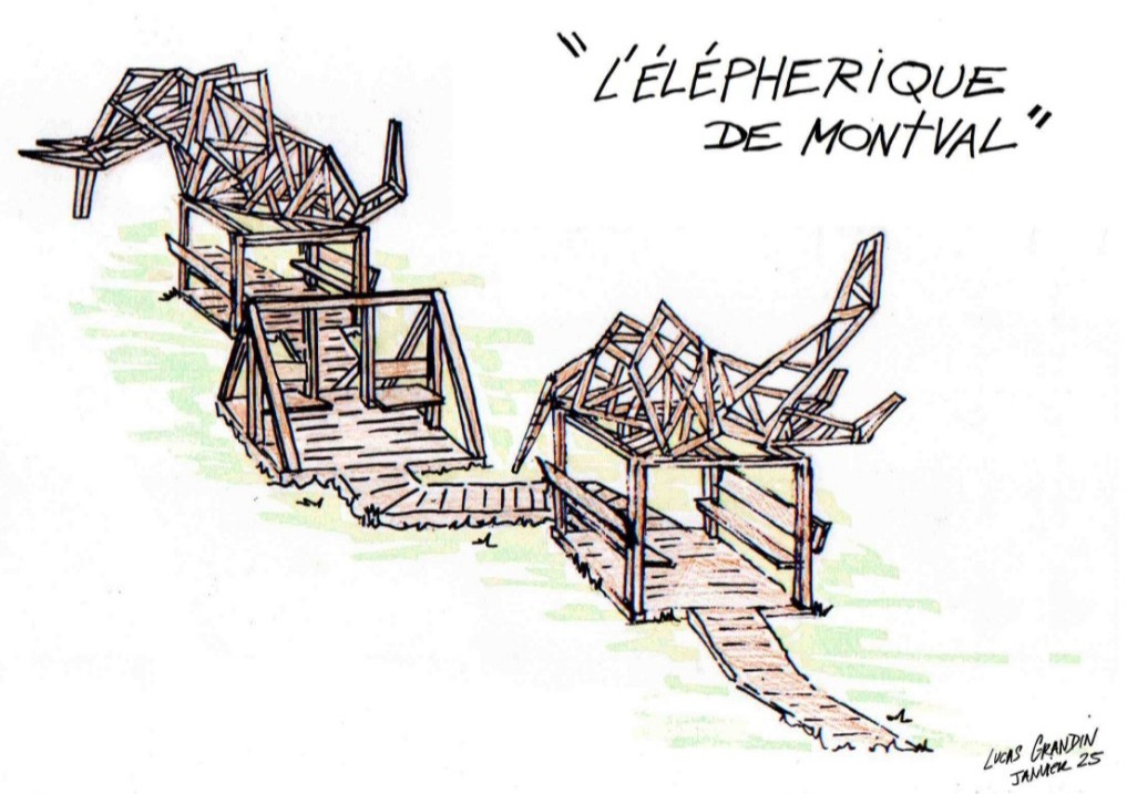 Lors de cette réflexion, deux idées sont ressorties, l’éléphant et le téléphérique, et Lucas Grandin les a compilées pour donner vie à L’éléphérique :