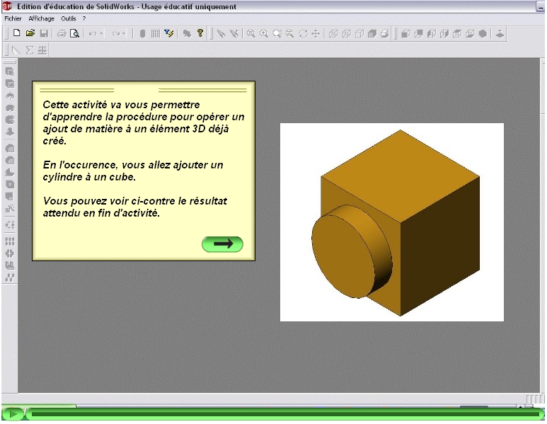 |  - réalisation d'un cube coté - réalisation d'un cylindre coté - modification d'une esquisse - ajout de matière - enlèvement de matière |  - réalisation d'une extrusion avec profil quelconque - ajout d'un chant perpendiculaire - ajout de congés - utilisation de la symétrie |