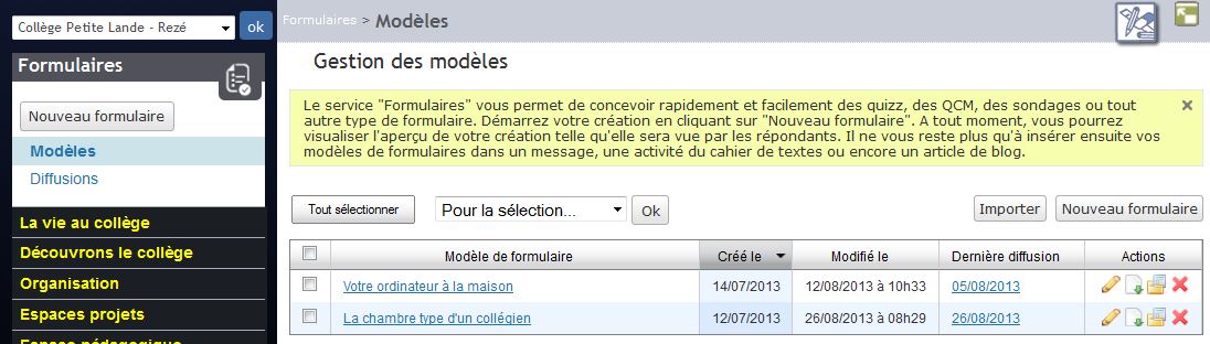 En cliquant sur ce service vous arrivez sur la gestion de vos formulaires. Outre la possibilité de créer, vous pouvez maintenant en importer et en exporter pour les communiquer à d'autres collègues..