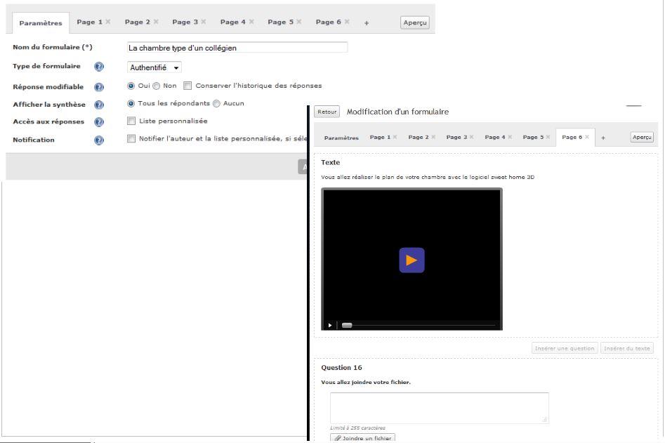 Outre le choix des paramètres, toujours important (on pourra avoir des formulaires avec plusieurs pages qui pourront contenir du texte, des questions avec différents types de réponses mais aussi des images, des vidéos, des animations flash), il est possible de demander aux répondants de joindre un fichier, ce qui en fait maintenant un vrai outil pédagogique pertinent.