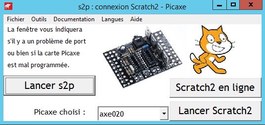 Une fois le dossier décompressé, vous exécutez le fichier s2p.exe pour qu'une interface vous aide à gérer la carte Picaxe et lancer Scratch2.