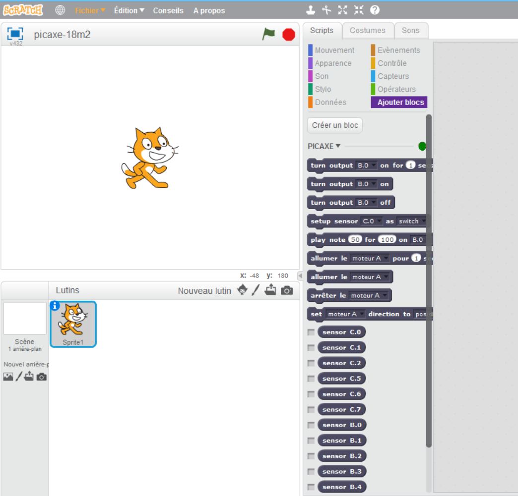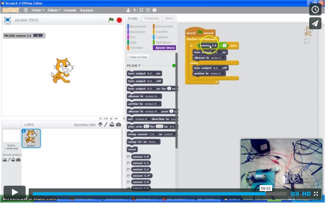 Voici comment faire piloter les entrées/sorties de l'interface Picaxe par le logiciel Scratch. Il suffit de lancer en même temps un petit logiciel qui va vous permettre d'aborder la programmation avec tous les niveaux de public.