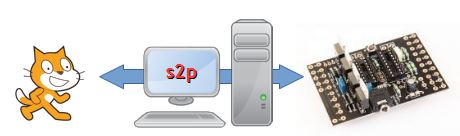 Le logiciel Scratch2 va activer des broches (ou PIN) des cartes Picaxe en entrée ou sortie pour vous permettre de contrôler vos montages. Mais pour que le programme communique avec la carte, il va falloir un petit logiciel qui va tourner en tâche de fond afin d'établir ce lien : s2p.