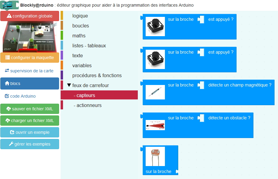 Ce qui a donné par la suite la notion de maquette pré-configurée dans Blockly@duino (pour toute amélioration de ce type, n'hésitez pas à contacter le créateur du logiciel sebastien.canet@ac-nantes.fr) :