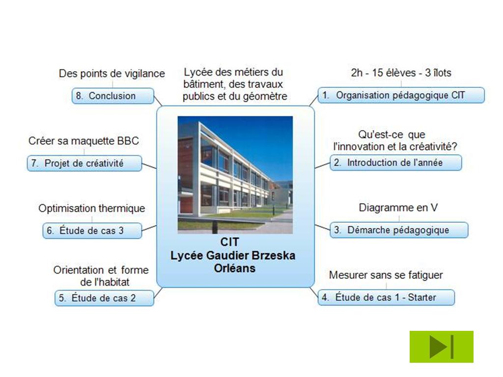 L'aboutissement, sera le projet de créativité. Pendant cette phase, les élèves mobiliseront les différentes découvertes des études de cas pour les réinvestir dans ce projet de conception d'un bâtiment à basse consommation d'énergie.