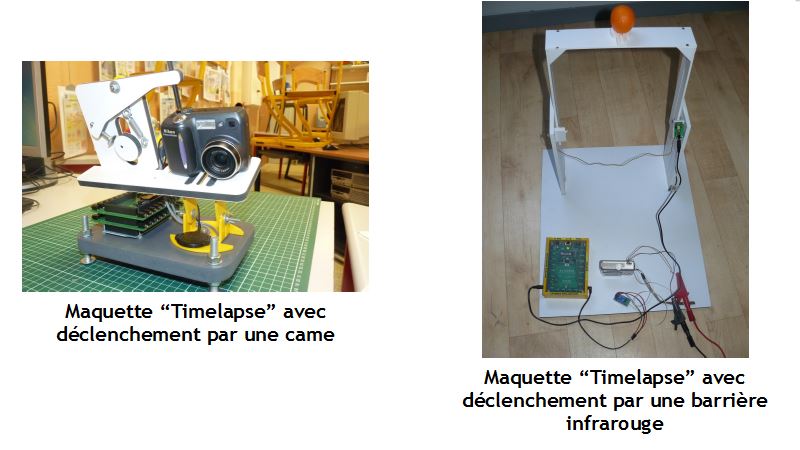 Dans le cadre de la journée de formation de technologie autour des prises de photos pilotées, des maquettes ont été présentées. En voici deux qui vont vous permettre de recycler de simples appareils photos numériques et dont le déclenchement diffère (barrière infrarouge ou came).