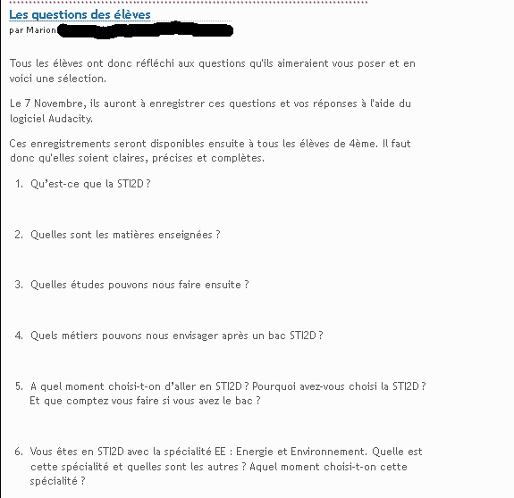 | Les élèves vont donc réfléchir à des questions qu'ils auront poser aux lycéens. Ils auront pour cela un Pad à leur disposition pour préparer ce travail. | | A la séance suivante, un bilan est réalisé pour sélectionner une quinzaine de questions. Un élève est ensuite chargé de déposer un article dans la rubrique commune avec le lycée. |