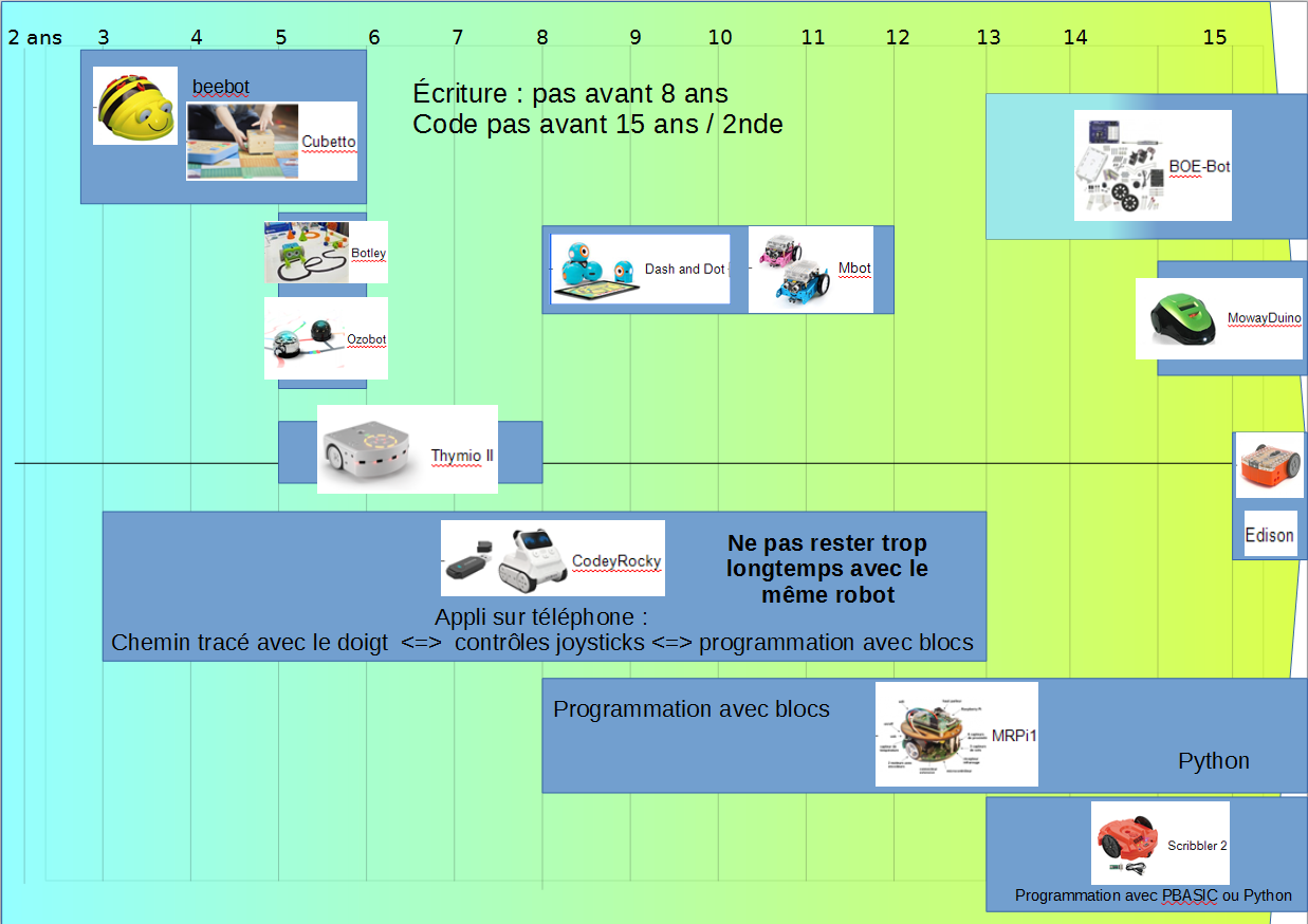 Depuis 2015-2016, la programmation est entrée officiellement dans les programmes de l’école et du collège. L’apprentissage de la pensée informatique peut se faire de façon « débranchée », c’est à dire sans matériel : résoudre de simples problèmes, sans ordinateurs ni matériels. Très souvent, après cette première approche, le matériel le plus prisé par les enseignants est le robot mobile, et on peut observer le même besoin d'initiation à la programmation et les mêmes réponses de la part des enseignants dans tous les pays. Toutefois, pour permettre une progressivité et ainsi se mettre au niveau des élèves, de nombreux robots ont été inventés pour correspondre à chaque âge. Le défi le plus courant est de créer un robot, ou d’en utiliser un existant, pouvant sortir d’un labyrinthe avec ou sans obstacle, piloté ou autonome.