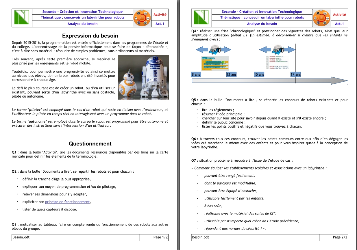 Les besoins et contraintes liés au labyrinthe sont recensés dans la question 7 du document exprimant le besoin :