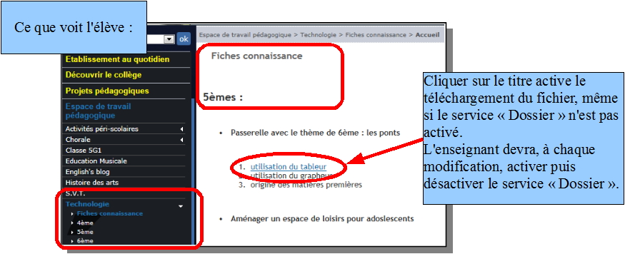 Les fiches connaissances se trouvent dans le service «Dossier» : on récupère l'adresse URL de chaque fichier, on fait les liens dans la partie souhaitée puis le service «Blog» est désactivé pour que personne (hormis le gestionnaire, donc l'enseignant) ne puisse modifier les articles.