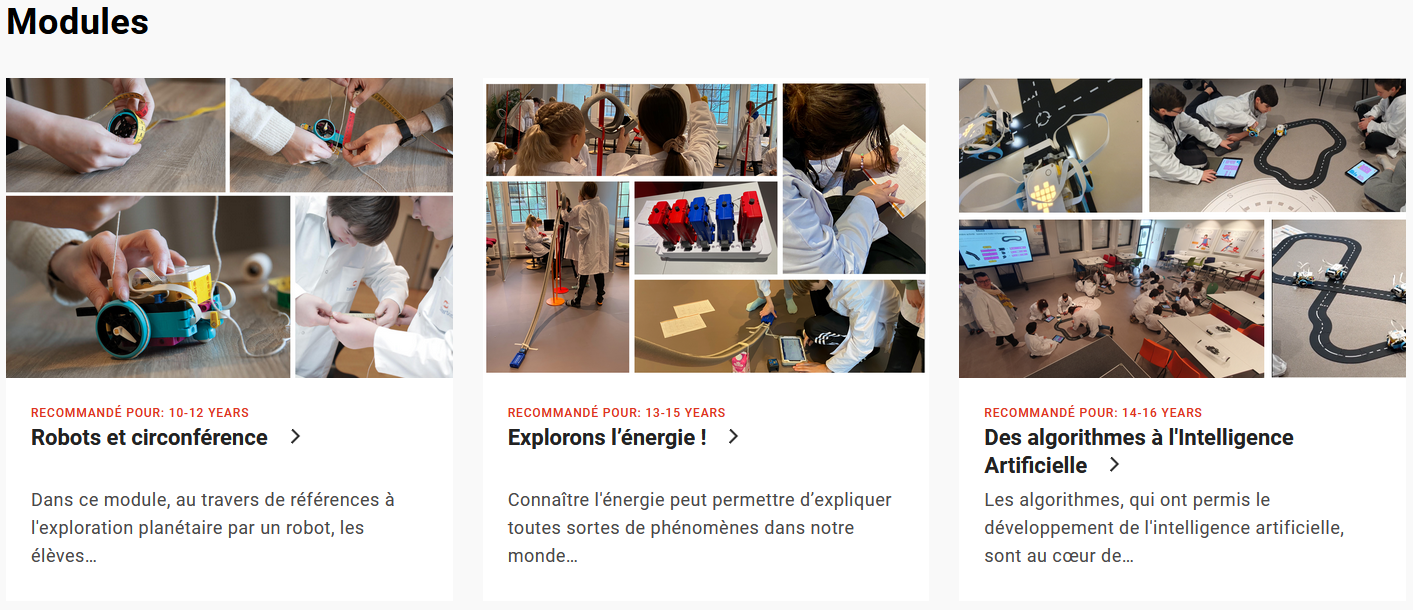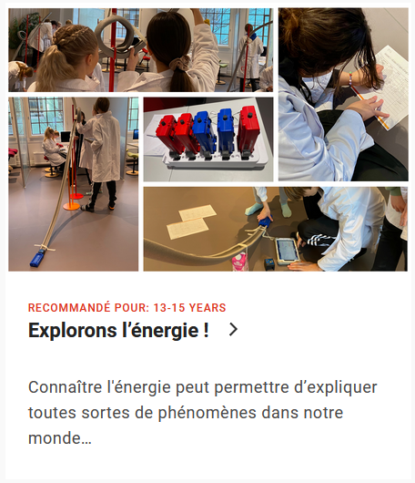 - Explorons l'Energie ! : Il s'adresse aux 4èmes, 3èmes, 2ndes. Il permet de (re)découvrir les concepts d'énergie (cinétique, potentielle et électrique), de transferts et d'efficacité énergétique. Les jeunes essaieront à travers différentes activités de déplacer des véhicules miniatures grâce à ces notions.