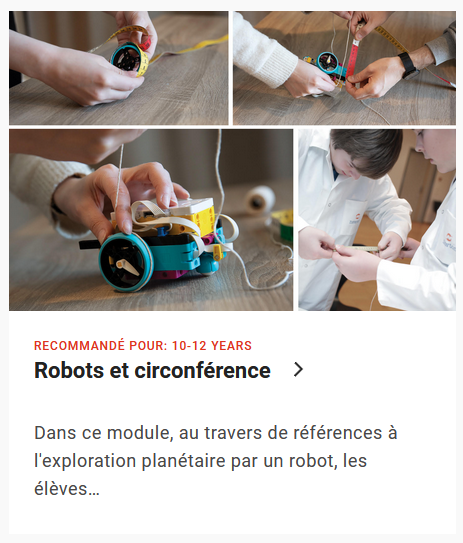 - Robots et Circonférence : Il s'adresse aux CM2, 6ème, 5ème. Il permet de (re)découvrir les notions de périmètres, circonférences et rotations à travers l'utilisation de robots LEGO® Education SPIKE™ Prime. Les jeunes devront approcher leur robot au plus proche d'un petit personnage sans le toucher ou encore lui faire parcourir une forme qu'ils auront dessinée.