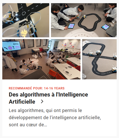 - Des algorithmes à l'Intelligence Artificielle : il s'adresse aux élèves de 4ème, 3ème, 2nde. Il permet de (re)découvrir les structures algorithmiques de base (séquence d'ordres simples, boucles, tests) et la manière de les programmer. Les jeunes devront programmer leur robot pour lui permettre de suivre automatiquement une piste, tout en évitant des obstacles imprévus.