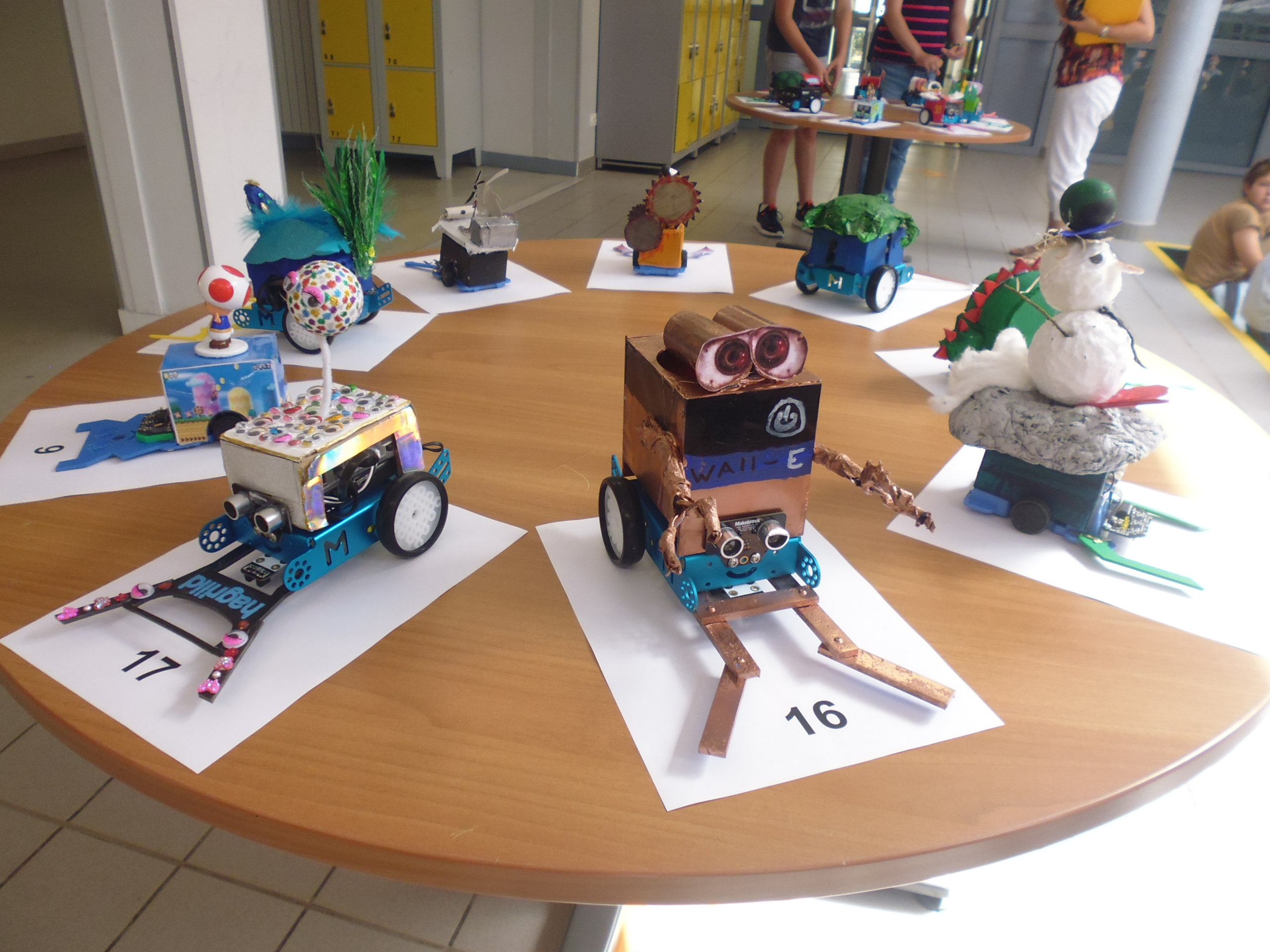 Tous les collèges travaillent sur une table de jeu où un robot doit éjecter les plots le plus vite possible tout en étant esthétique. Les robots utilisés sont les mini robots de picaxe (où l’on travaille la programmation en blocs ou en algorithmie ) ou alors les Mbot (programmation en blocs).