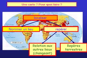 3.- Au juste, à quoi sert une carte ? Questionner les évidences : « On voit des cartes partout, mais à quoi servent-elles ? » - Faire questionner les élèves sur le sens des mots utilisés. Objectif : passer du vocabulaire social aux mots du géographe et donner du sens à ces mots. « Une carte pour se localiser : mais ça veut dire quoi, localiser ? » | ![]() « Comment peut-on se repérer dans n'importe quel endroit de la planète ? » - avec un ballon de baudruche :