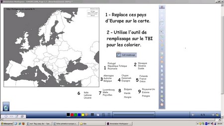 - Quand il l'a trouvé, l'élève colorie son pays sur sa fiche, puis il va au TBI placer correctement le nom de son pays et le colorier.