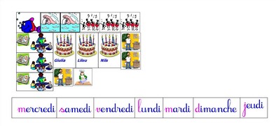 Les élèves apprennent à manipuler le crayon (sélectionner un élément, glisser et déposer) et son clic droit (outil clonage) pour dupliquer certaines étiquettes. Les élèves verbalisent ce qu'ils font. Ils énoncent des phrases en utilisant la syntaxe et le lexique liés au temps qui passe (Nous irons à la piscine tous les vendredis. Mercredi est entre le mardi et le jeudi. L'anniversaire de Julie est un jeudi ...). Le lexique abordé, défini au préalable par l'enseignante (lien vers annexe 1), est introduit et réinvesti à de nombreuses reprises.