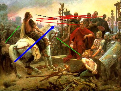 6) Les prisonniers gaulois : Tracer sur le TNI l'orientation des regards de ces personnes. Demander aux élèves d'exprimer avec un vocabulaire précis l'attitude, la position et le regard des prisonniers.