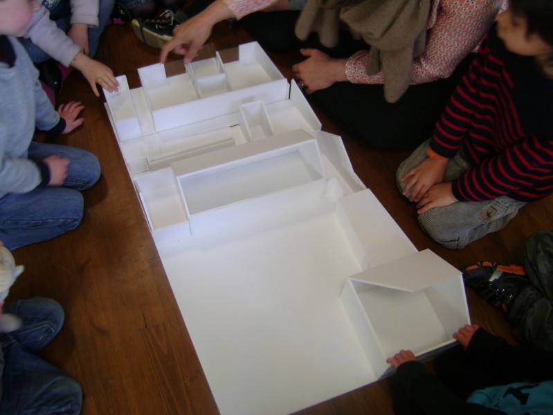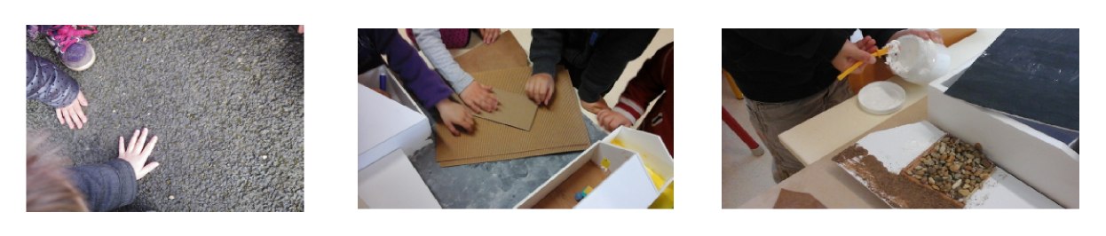 fabrication d'une maquette Les enfants réinvestissent le vocabulaire appris lors d'un atelier pendant lequel ils collent différents matériaux sur une maquette réalisée préalablement. Le groupe se rend dans les différents lieux pour observer et décrire une nouvelle fois la matière. Les enfants apprennent à se repérer sur la maquette et choisissent la matière qui correspond le mieux à la réalité.