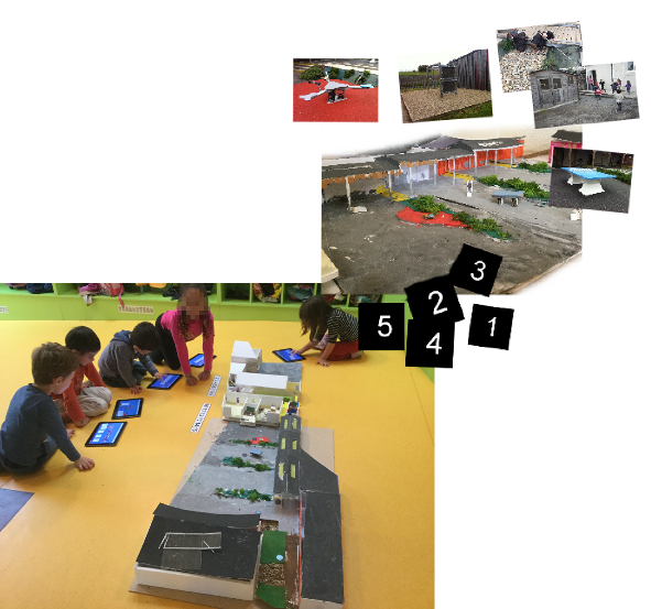 jeu de repérage (version papier) L'enseignante propose un jeu structuré pour faire acquérir explicitement des apprentissages spécifiques de repérage. Le jeu consiste a associé un numéro placé sur la maquette à une photo représentant un des lieux proches préalablement observé. Cette séance permet de mobiliser le vocabulaire d'orientation spatial appris dans des situations variées.