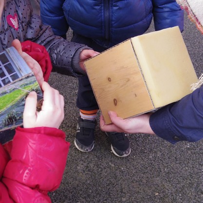 Pour mener cette activité, nous utilisons 2 cubes. Sur les faces de l'un des cubes, est collée une photo d'un espace connu des enfants. Sur l'autre cube, chaque face correspond à un matériau que l'on peut rencontrer. Le cube image permet d'orienter le groupe d'enfants vers le lieu représenté. Puis, par le toucher, les enfants comparent les différentes textures du cube avec les textures rencontrées sur place. Les enfants expriment leur ressenti, l'enseignante apporte le vocabulaire servant à désigner les matières (bois, métal, bitum...) et leur aspect (lisse, rugueux, dur, transparent...). Le vocabulaire est utilisé en situation.