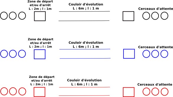 - 1 seul enfant par couloir. - Utiliser des couleurs différentes par atelier (couloir, zones et cerceaux d'une même couleur). - Les couloirs peuvent être de différentes dimensions. - Ne pas modifier les dimensions des zones d'arrêt et/ou départ. - Après chaque passage, prendre la file d'attente.