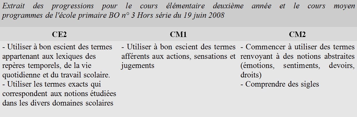Les progressions pédagogiques pour le cycle 3 précisent les mots à étudier, en fonction du niveau de classe pour les domaines des sciences expérimentales et technologie, l'histoire et la géographie.