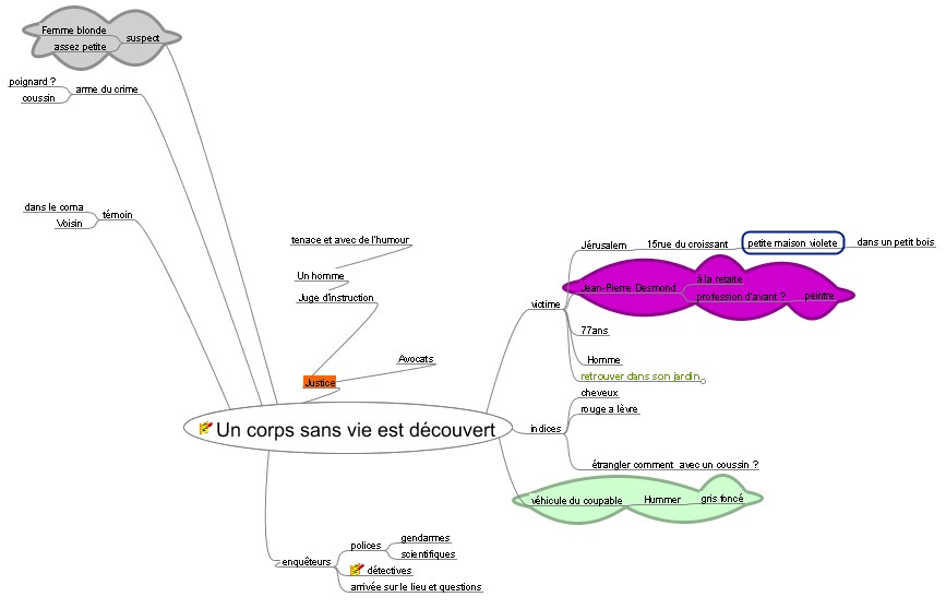 Création d'une carte mentale « enquête » sur la base du noeud principal : Un corps sans vie a été découvert. Les termes de vocabulaire sont réinvestis en fonction des différents noeuds créés. On conseillera aux élèves d'utiliser la fenêtre de notes pour le noeud principal afin de conserver leurs remarques d'écriture par binôme.