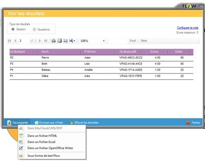 Après la séance : L’enseignant peut, en fin de séance, enregistrer l’ensemble des résultats obtenus au cours de la session. Il peut ainsi conserver une trace du travail produit et analyser finement les réponses individuelles.