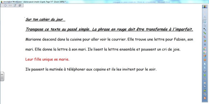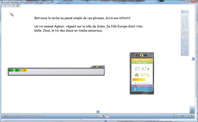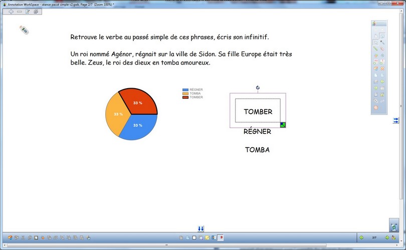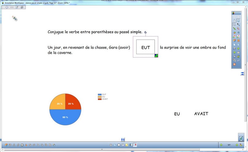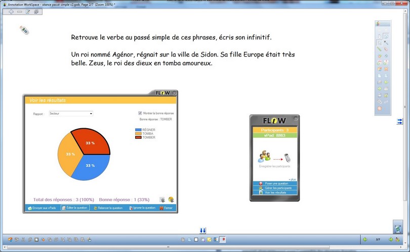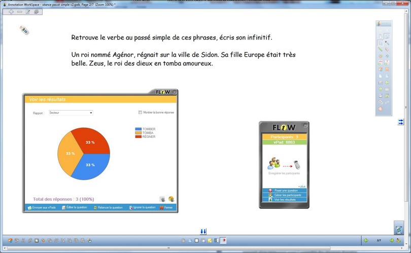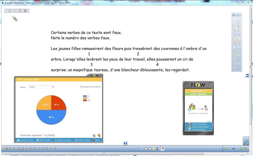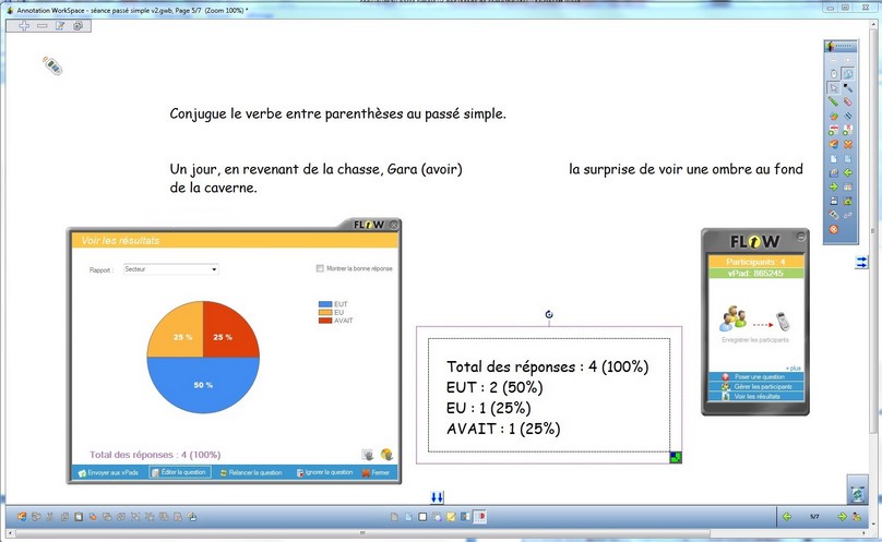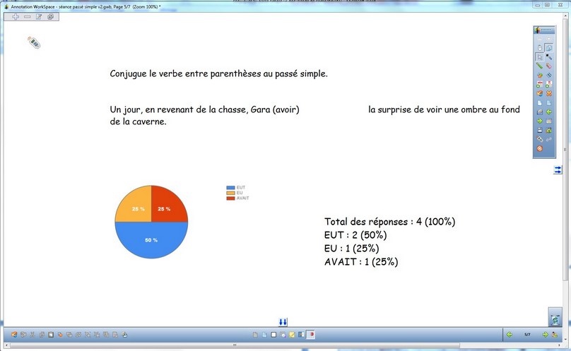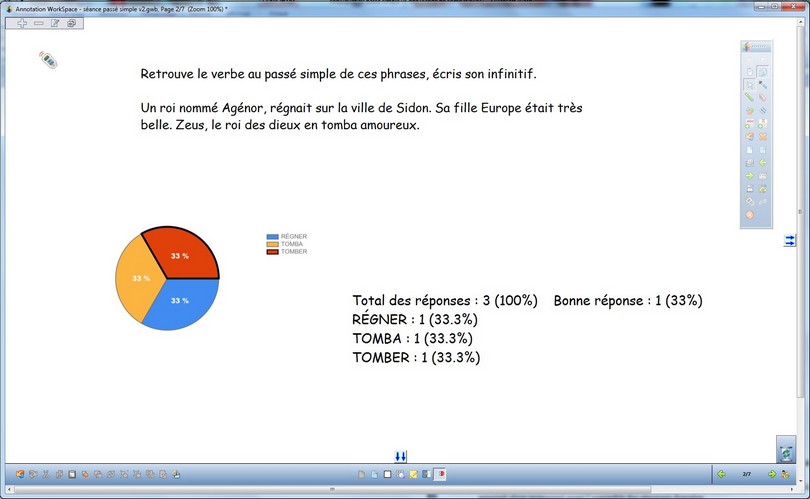 En amont, les élèves ont déjà abordé le passé simple lors de séances précédentes (distinguer imparfait / passé simple, règles d’utilisations de ces deux temps, conjugaison des verbes attendus dans les programmes). Un document de référence (séance passé simple.gwb) servira de conducteur de séance. Il proposera, au travers de différentes pages, les travaux et questionnements attendus. Page 1 : Découverte et lecture orale du texte support des exercices à suivre. Page 2 : « Retrouve le verbe au passé simple, écris le à l’infinitif. » Chaque élève répond à l’aide de son boîtier. Dans les protocoles de questionnement proposés par l’application, il s’agit de réponses courtes. Les boîtiers permettent en effet de répondre en saisissant du texte à concurrence de 140 caractères maximum.