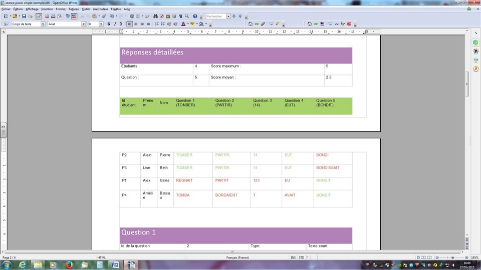 Copie d’écran d’une des pages du document montrant l’ensemble des réponses obtenues par élève. Le document est éditable.