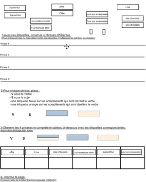 En construisant des phrases à l'aide d'étiquettes qu'ils déplacent, les élèves découvrent les propriétés des compléments d'objet ( non déplaçables) et des compléments circonstanciels ( déplaçables, supprimables, le plus souvent) ...