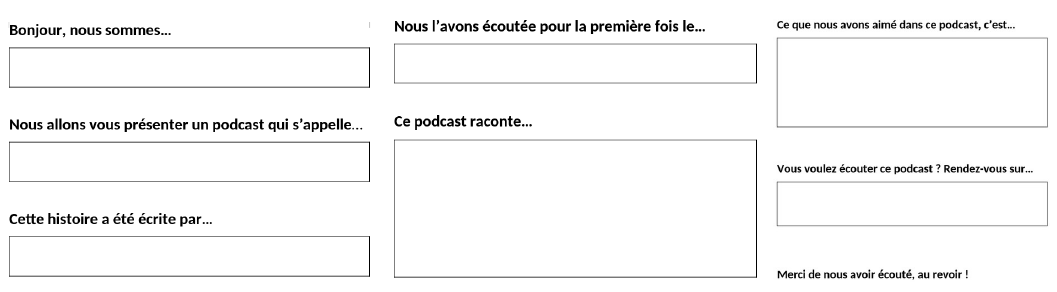 Cette trame a été présentée et analysée en classe. Puis, remplie collectivement en dictée à l’adulte, elle a permis la création d’un texte collectif de présentation d’un épisode écouté spécialement « Les animaux de la mer », du podcast Octave et Mélo de France-Musique.