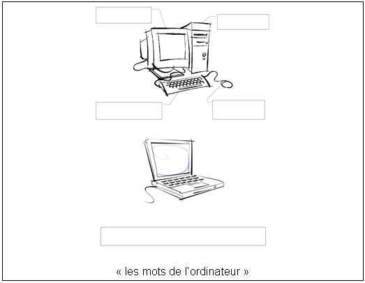 - Rappels par les élèves et à l'oral, du vocabulaire vu précédemment (clavier, souris, écran, unité centrale, ordinateur portable).