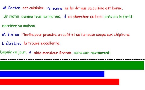 2. Après cette phase de recherche, le même texte est affiché au T.B.I. avec des groupes de mots de trois couleurs différentes : les élèves doivent retrouver à quoi correspond chaque couleur. Bilan oral et affichage à l'écran.