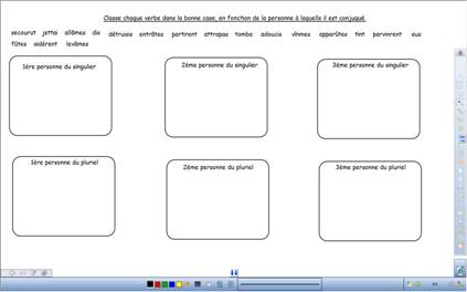 Les élèves ont face à eux, projeté au TBI (Fig.1), une liste de 18 verbes conjugués au passé-simple aux différentes personnes. Ils vont devoir, chacun leur tour, venir faire glisser chaque verbe dans la bonne case en fonction de la personne à laquelle il est conjugué. Pour chaque proposition, les élèves devront justifier leur choix et éventuellement modifier leur réponse en fonction des remarques de leurs camarades.