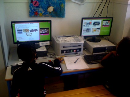 Deux ordinateurs en réseau installés en fond de classe avec une imprimante et des casques d'écoute. Une salle informatique avec sept postes en réseau et un vidéo-projecteur éventuellement.
