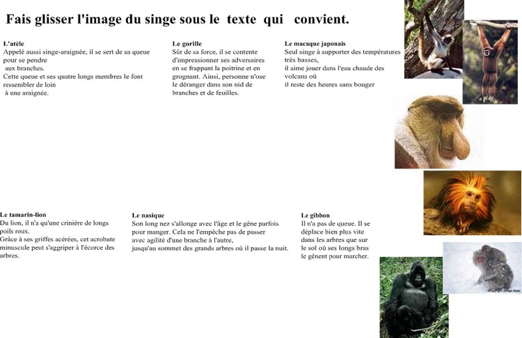 Lecture des textes proposés (les questions et réponses dans l'exemple du document sur le tigre ; les descriptions dans l'exemple du document sur les singes)