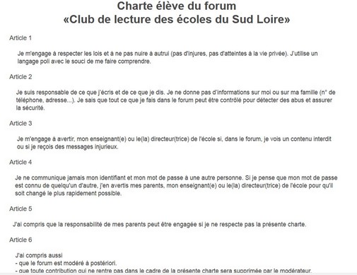 Un tel travail d'écriture et de communication collective ne peut s'envisager qu'avec une connaissance parfaite des règles qui vont régir son utilisation. L'enseignant(e) invite les élèves à prendre connaissance de la charte qui régira cette activité tout au long de sa durée. Il insistera sur les points essentiels qui permettent d'assurer la qualité et la bonne tenue des échanges. Les notions d'Internet Responsable seront ici pleinement mobilisées. Cette analyse de la charte permettra d'initier un débat autour des usages des réseaux sociaux. Les notions de modération à priori ou à posteriori seront explicitées.