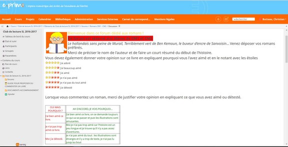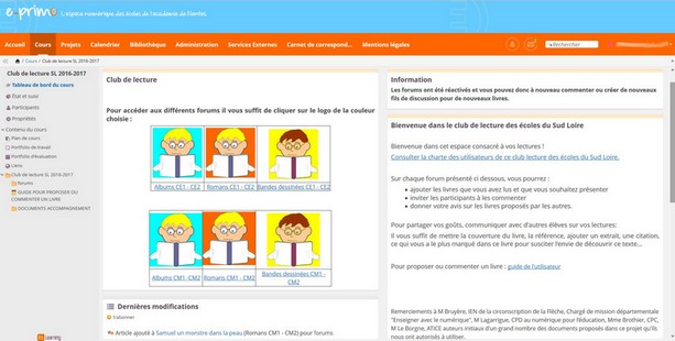 Ce projet de forum regroupait cette année 12 classes de deux circonscriptions (337 élèves, 18 adultes encadrants, enseignants, cpc, enseignants référents pour les usages du numérique). Il met à disposition des classes un espace de type forum dans l'environnement de travail e-primo (solution académique d'ENT pour le premier degré). Cet espace propose une structure de publication et d'échange autour de la littérature de jeunesse. Nous décrivons ici le fonctionnement attendu et observé en général pour les classes associées.
