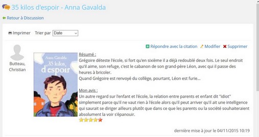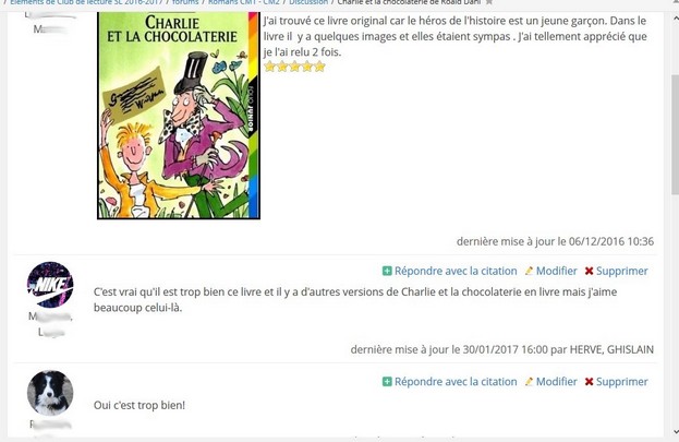 Ces deux séances conduites, le projet peut être alors totalement mis à la disposition des élèves. Les ouvertures de fils de discussion seront toujours modérées à priori par l'enseignant(e) (afin d'éviter les doublons, les erreurs de classification, d'évaluer la pertinence des contenus, d'encourager les enrichissements). Les commentaires feront eux l'objet d'une modération à posteriori. L'ENT étant accessible 24h sur 24 nous observons chaque année l'apparition de contributions proposées en dehors des heures de classe. Ce sont bien certains des objectifs de ces forums qui pourront ainsi être atteints. Libérer, faciliter, encourager, l'envie de partager autour de ses lectures. Favoriser ainsi la découverte de nouveaux ouvrages, contribuer au développement du plaisir de lire, apprendre à communiquer sur ces sujets, à justifier ses sentiments avec pertinence...