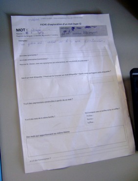 2- Travail individuel , de rédaction de la fiche d'exploration des mots (voir photo) à partir du recueil des mots de la classe. Les rubriques se complètent en fonction des programmes et en assistant les élèves mais une fiche exemple peut être renseignée au VPI.