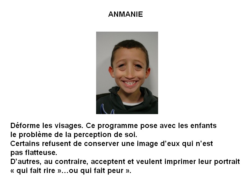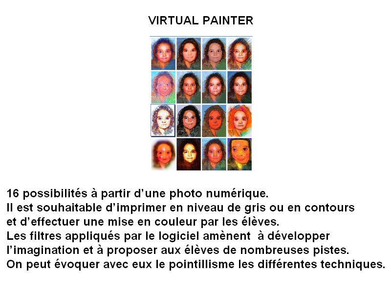 Après visualisation de portraits « à la manière de » il est présenté aux enfants le fonctionnement des différents logiciels utilisables pour réaliser des portraits différents à partir de leurs portraits (photos numériques).