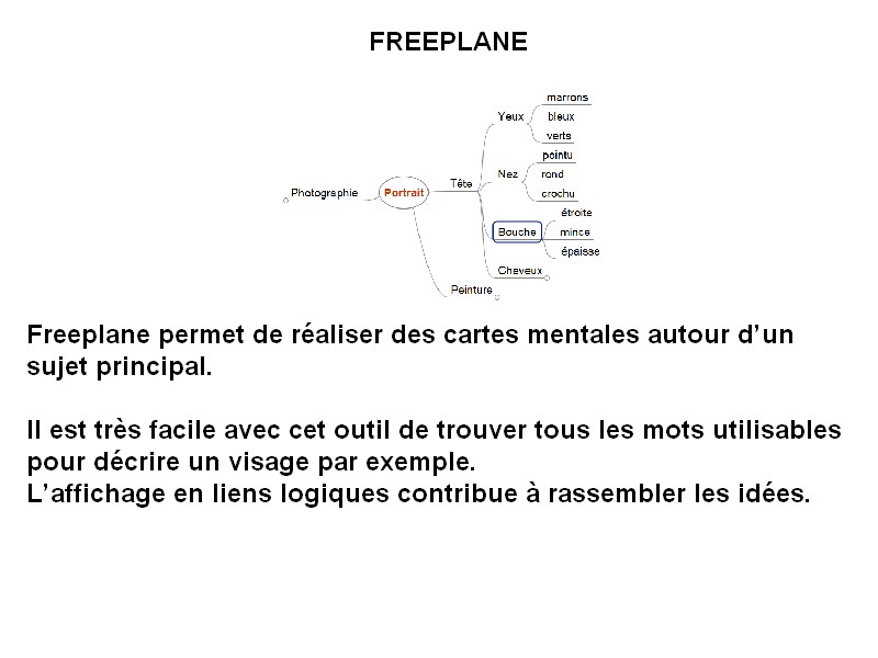 Par la suite l'utilisation d'une carte mentale (freeplane) permet de rassembler le vocabulaire descriptif en rapport avec le visage. A partir d'une description, réaliser le portrait robot de quelqu'un et deviner de qui on parle.