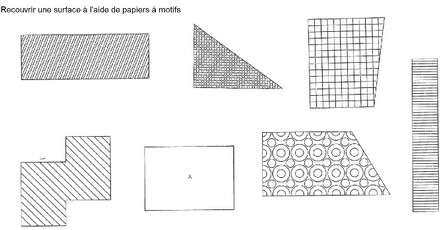 1- Découverte de la situation problème : recouvrir une surface à l'aide de papiers à motifs. Choisir les surfaces pouvant recouvrir entièrement la surface de référence. Recherche par équipe de 2. il est possible de transformer les papiers à motifs, de les plier, de les découper, d'en déplacer des morceaux...
