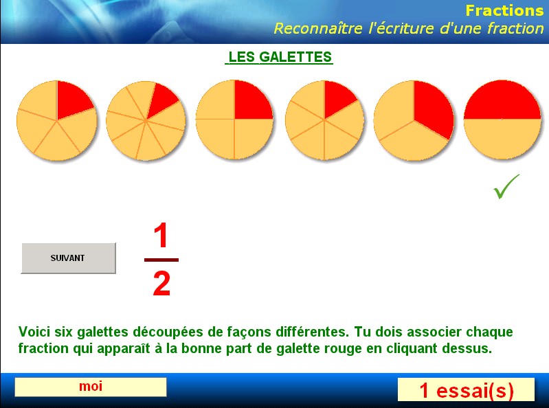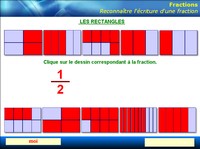 Phase de remise en mémoire des différentes notions en utilisant le logiciel « Reconnaître » qui propose différentes représentations de la fraction, l'élève devant retrouver la représentation correspondant à la fraction écrite. Trois types de représentations : la galette, la réglette et le rectangle. Recherche individuelle sur le cahier d'essais, réponse et validation au TBI.