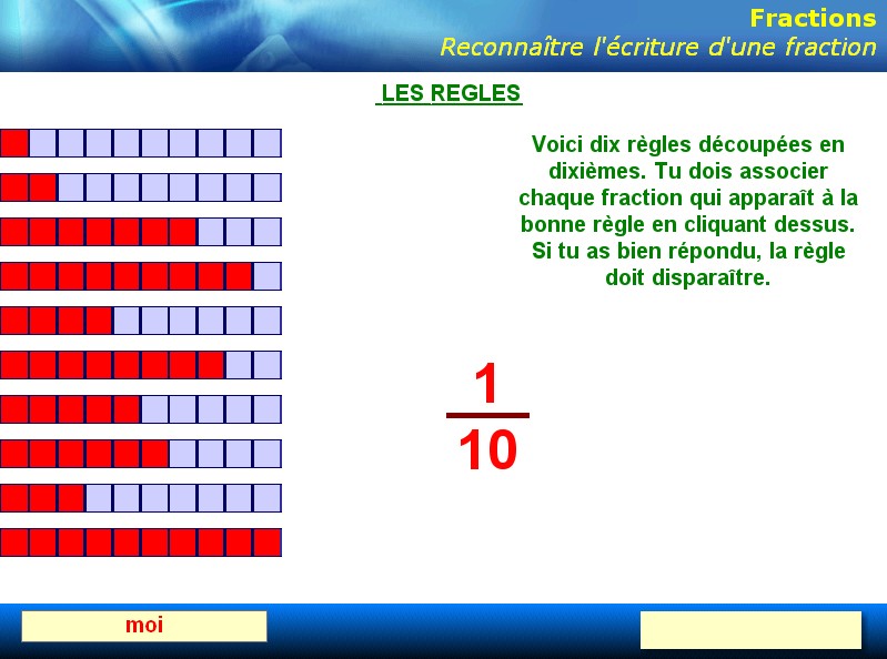 Approfondissement I : utilisation du logiciel « Fractions ». L'élève doit écrire la fraction correspondant à la représentation donnée par le logiciel sous forme de réglette.